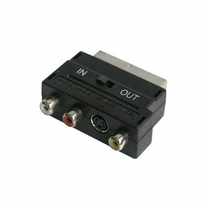 Prelaz sa SCART na 3 CINCH (RCA) (video i 2x audio), In/Out prekidač za gledanje ili snimanje, S-VHS konektor.