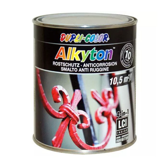 DUPLI-COLOR ALKYTON je antikorozivni sustav boja na bazi alkid-uretana, koji kombinira četiri proizvoda u jednom: temeljni premaz, zaštitu od hrđe, boju i brtvljenje. Ova boja s vrlo dobrom pokrivnošću iznimno je fleksibilna i otporna na udarce, čak