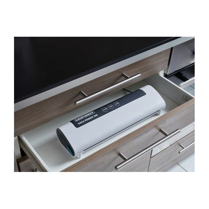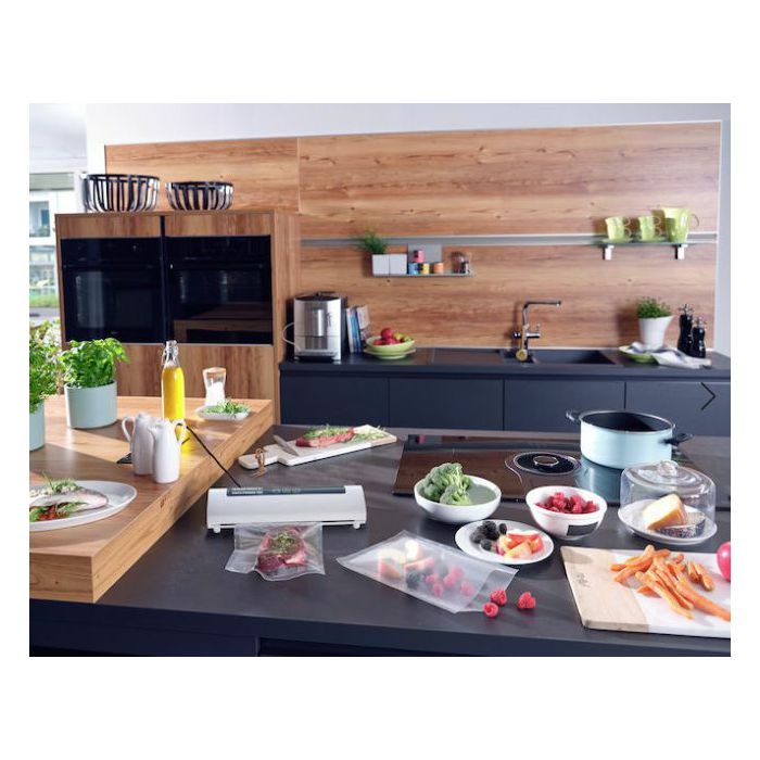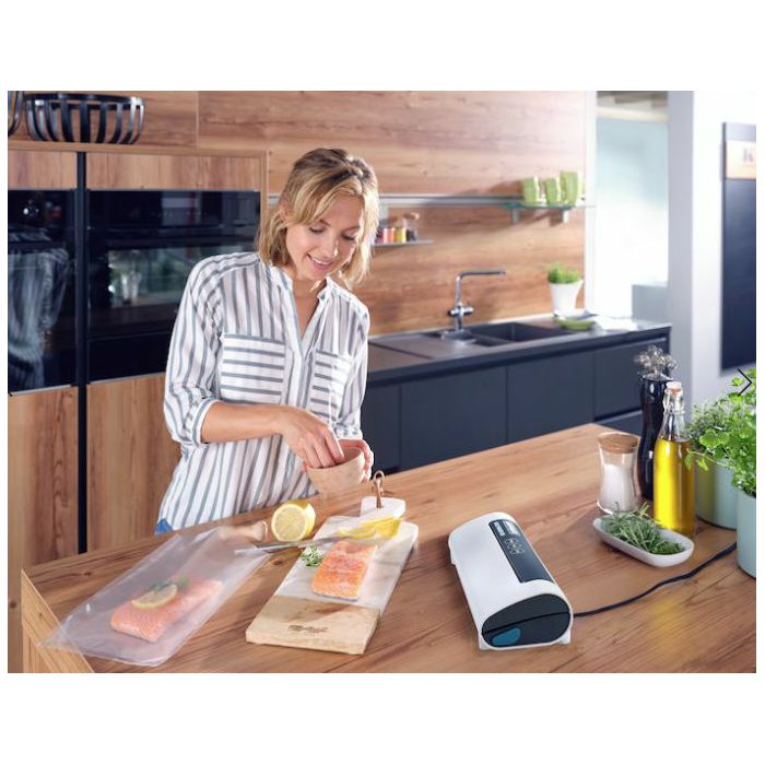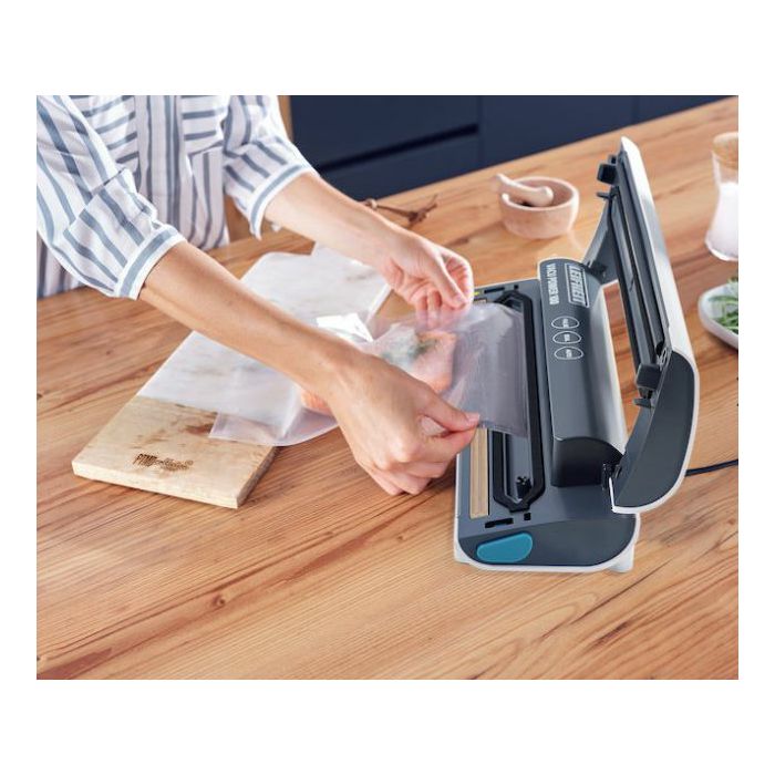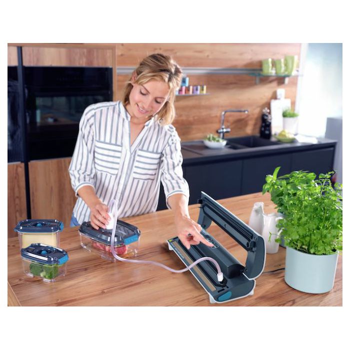 Električno i potpuno automatsko vakumiranje hrane pomoću vakuum uređaja Leifheit Vacu Power 100. Za korištenje s voćem, mesom, ribom ili povrćem – vakuumsko zatvaranje održava sadržaj svježim pet puta dulje. I to prirodno bez potrebe za konzervansima