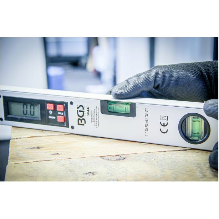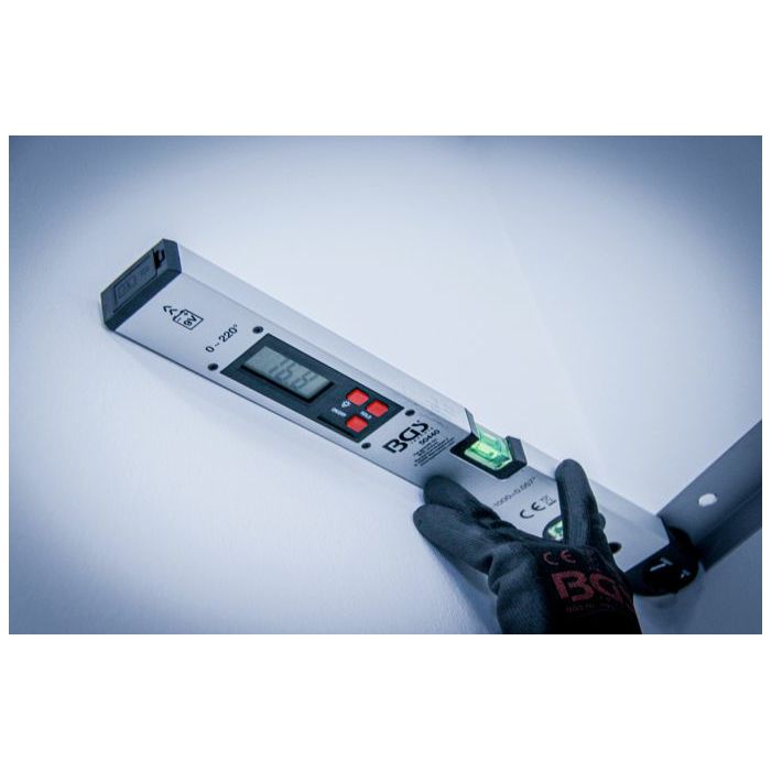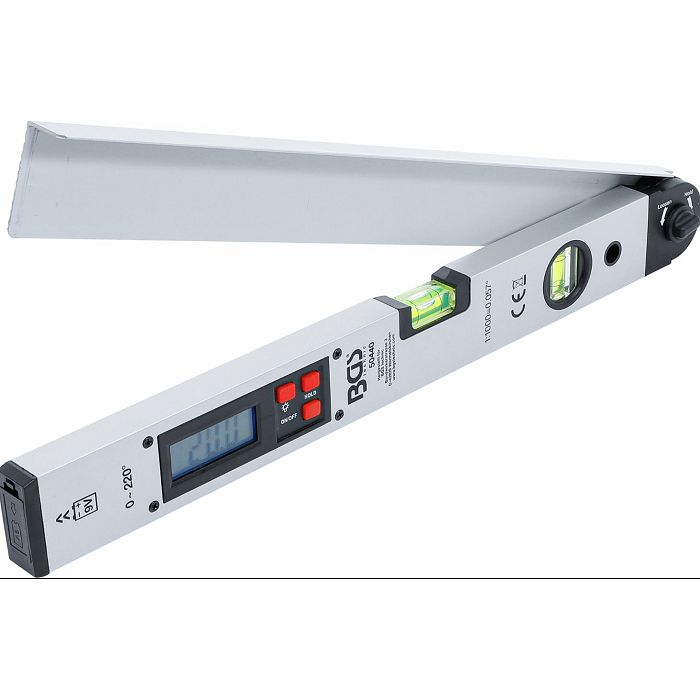 za prijenos i mjerenje kutova ,HOLD-funkcija za držanje izmjerene vrijednosti, osvijetljen LCD zaslon, kut radnog raspona od 0 do 220 ° ,razlučivost 0,1 ° ,kut preciznosti