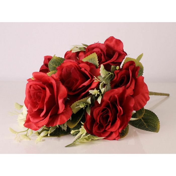 Prekrasni umjetni buket ruža u bordo crvenoj boji. Izuzetna bordo crvena boja i raskošno zelenilo u