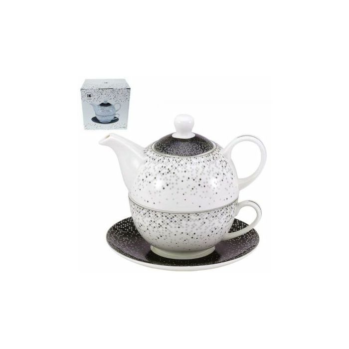 ČAJNIK S ŠALICOM I TANJURIĆEM PORCULAN 400+260 ML -CRNO-BIJELI I SREBRNA LINIJA