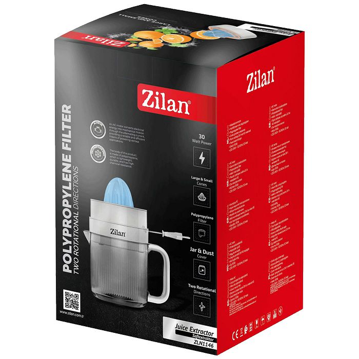 Citruseta, cjediljka (sokovnik) voća • Snaga 30W • AC motor • Glavno tijelo od poliropilena • Filter od polipropilena • Veliki i mali konus • Poklopac za staklenku i prašinu 2u1 s AS materijalom • Dva smjera rotacije • Buka 80 Db • Bez BPA