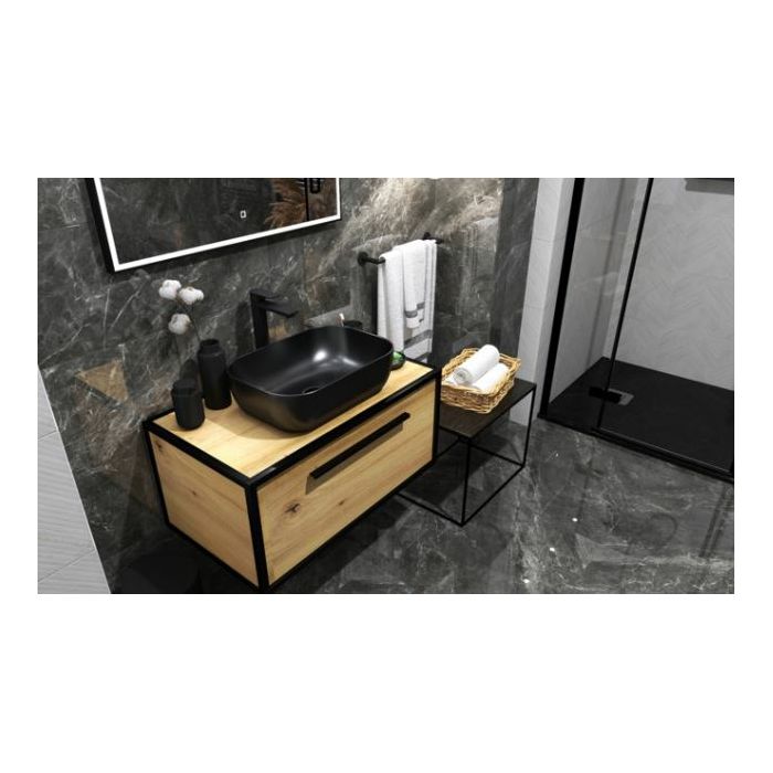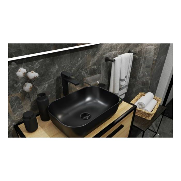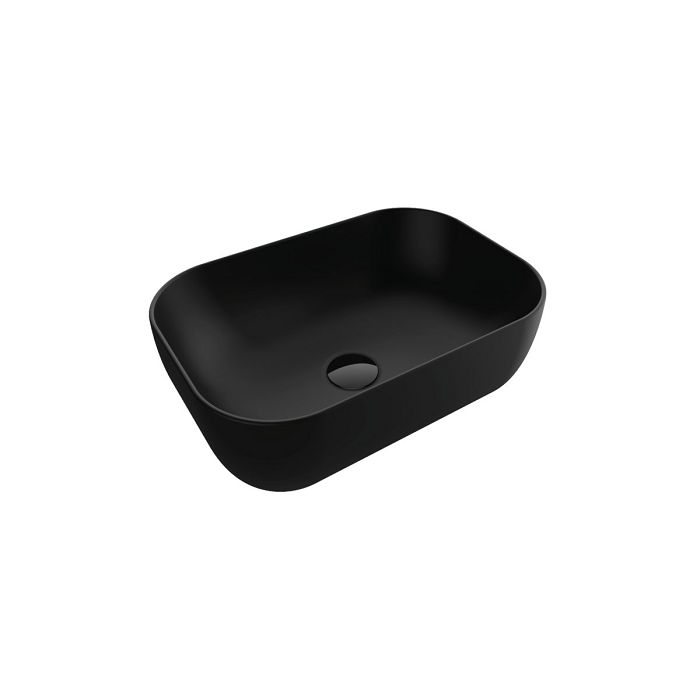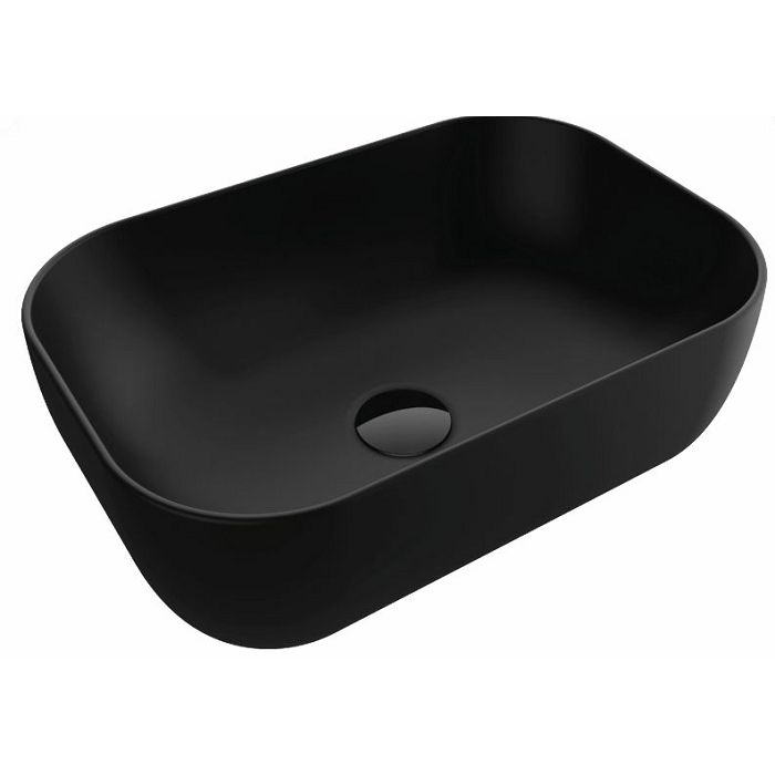 Concepto Bell 46,5 nadgradni umivaonik modernih elegantnih linija i pravokutnog oblika, mat crne boje. Izrađen od kvalitetne keramike, za ugradnju na ploču. Bez rupe za miješalicu. Umivaonik je bez preljeva zbog čega je preporuka montirati ga sa sifo