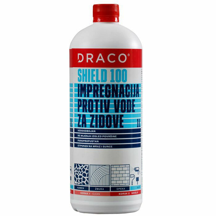 DRACO SHIELD 100 je vododbojni proizvod namjenjen zaštiti mineralnih površina od vlage koji je, za razliku od tradicionalnih proizvoda koji stvaraju film, u mogućnosti penetrirati u dubinu materijala koji se tretira i na taj način stvoriti hidrofobiz