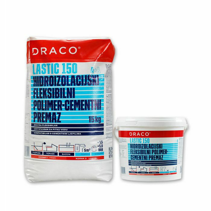DRACO LASTIC 150 je visoko fleksibilni, dvokomponentni hidroizolacijski premaz na bazi cementa modificiran emulzijom akrilnih polimera uz dodatak agregata fine granula