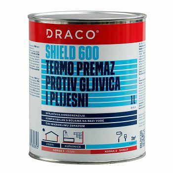 DRACO SHIELD 600 je zaštitni anti-kondenzacijski premaz za hladne površine (armirano betonski zidovi i stupovi, neizolirani zidovi itd.) za sprječavanje nastanka gljivica i plijesni. Zahvaljujući svojim karakteristikama održava površinu toplijom pa t