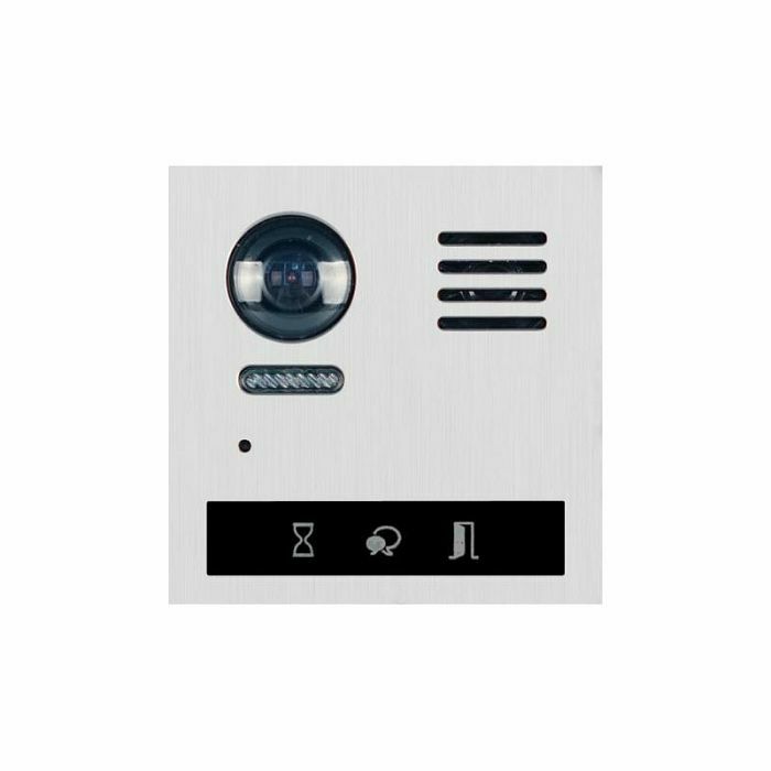 Vanjska jedinica za poziv s kamerom u boji riblje oko (170 °) i 1 tipkom za poziv. Od nehrđajućeg čelika. IP54 zaštita. Ugrađeni RFID čitač (125 kHz). Površinska montaža. Napajanje 24 VDC.