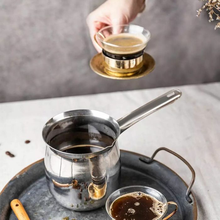 Čelični lončić kapaciteta 700 ml klasična je posuda za kuhanje aromatične turske kave. Izrađen od visokokvalitetnog nehrđajućeg čelika, izdržljiv je, jednostavan za održavanje i svestran u upotrebi. Zahvaljujući praktičnom izljevu, praktično ćete