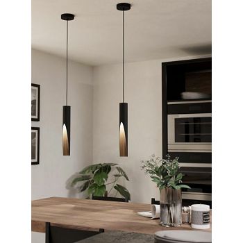 BARBOTTO jednostruka cjevasta visilica izrađena je od crnog metalnog tijela s završnim slojem od drvenog furnira iznutra. Visilica emitira ugodnu toplu bijelu svjetlost. Ukošeni donji dio svjetla omogućuje pogled na elegantan interijer obložen drveni