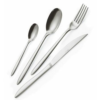 Shark je kolekcija pribora za jelo od nehrđajućeg čelika s poliranom završnom obradom. Set se sstoji od : - 4 vilice - 4 žlice - 4 noža - 4 čajne žličice Shark je kolekcija pribora za jelo s asimetričnim i zaobljenim dizajnom ručke. Ovaj mo