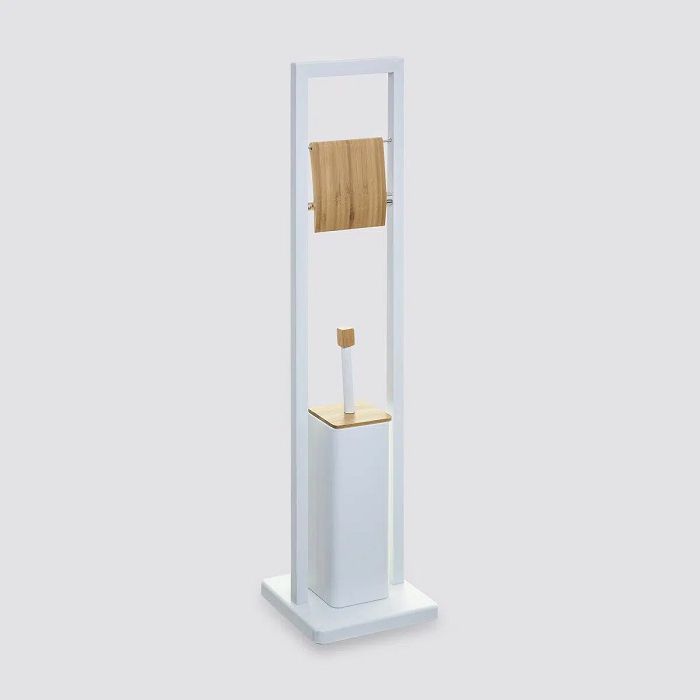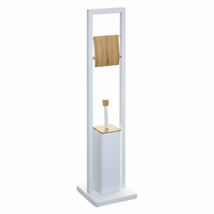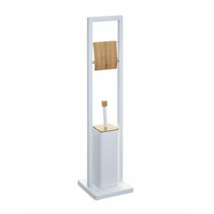 Moderni bijeli držač wc papira sa spremnikom za wc četku. Praktičan element potreban svakoj kupaonici. Izrađen od kombinacije bambusa i metala. Dimenzija: 20x20x60 cm.
