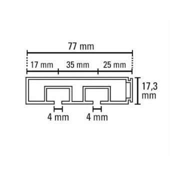 Nadgradna tračnica, plastificirana s jezgrom od materijala na bazi drva, 2 kolosijeka, širina kolosijeka cca 4 mm, s profilom za pričvršćivanje panela, kompletan set uključujući kotrljajuće prstenove, završne kape, kočnice, poklopce za bušilicu rupe