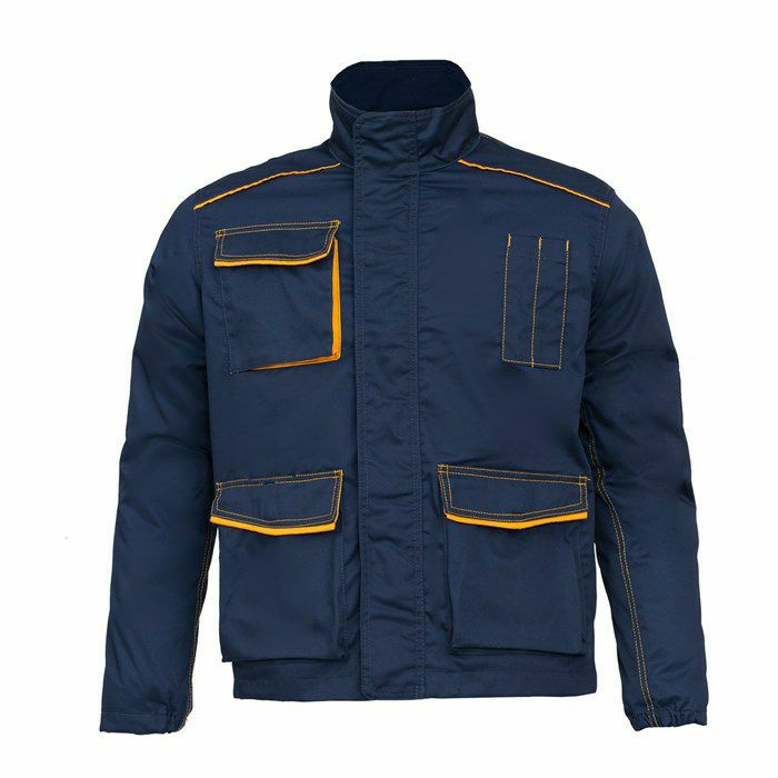 Radna jakna izrađena je od izdržljive tkanine u mješavini poliestera i pamuka. Kopča se skrivenim patent zatvaračem i drukerima, ima klasični ovratn