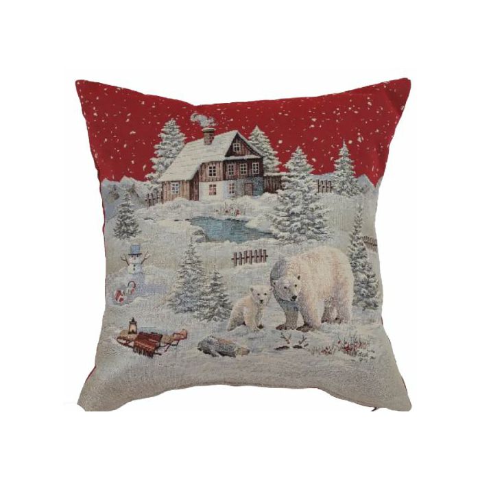 Poleđina ove jastučnice jednobojna je crvena ili bež, dok na prednjoj strani ima upečatljiv motiv polarnih medvjede ispred brvnare, koji donosi zimsk
