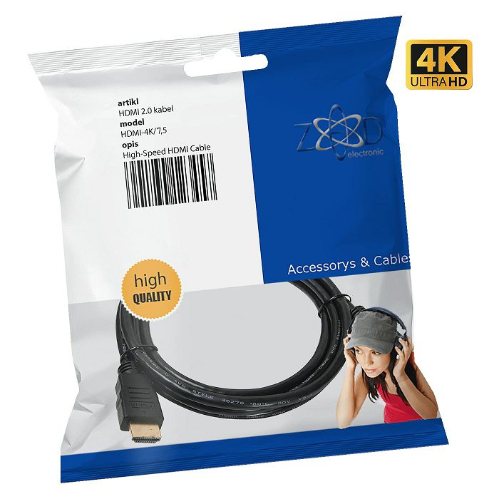 HDMI kabel + Ethernet, ver.2.0, propusnost do 18 Gbps, 4K, UHD, 3D, pozlaćeni konektori, dužina 7.5 met.