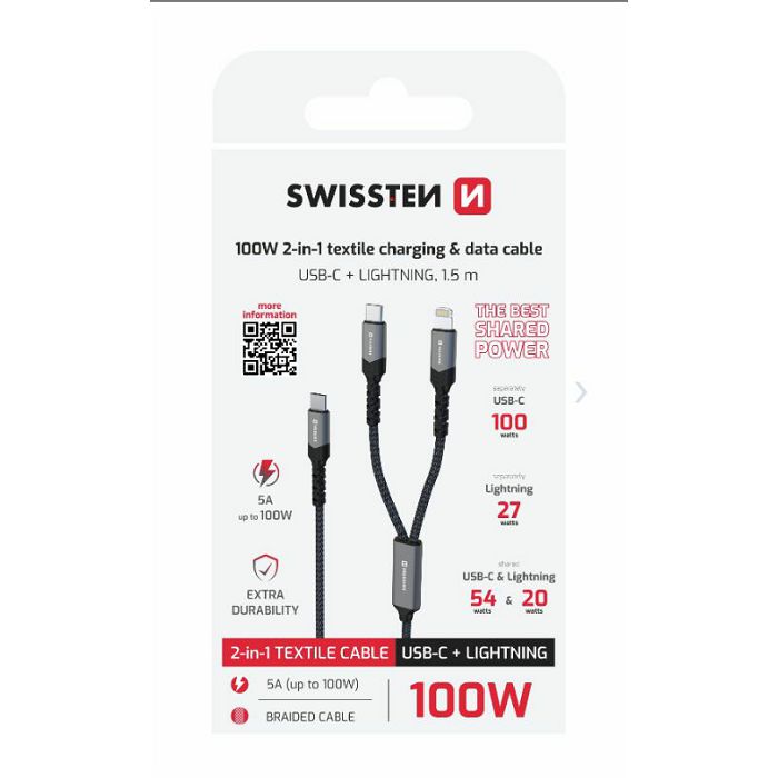 KABEL SWISSTEN 2U1 USB-C/USB-C+LIGHTN, 100W, 54W+20W, 1,5M TEKSTIL CRNI