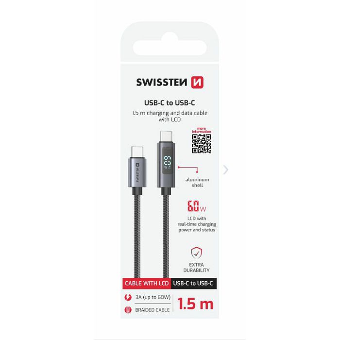 SWISSTEN LCD kabel USB-C / USB-C 1,5 m sa zaslonom, prikazuje snagu punjenja u vatima, indikator napajanja.
