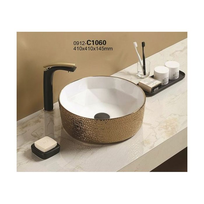Concepto Bell 42 nadgradni umivaonik, okruglog oblika i modernog dizajna. Izrađen je od kvalitetne keramike, za ugradnju na ploču, bez rupe za miješalicu. Zlatne je boje što će se uklopiti u moderno uređene kupaonice. Dimenzije umivaonika: širina 42