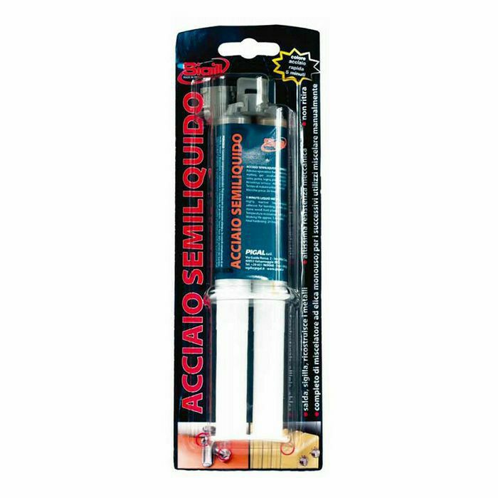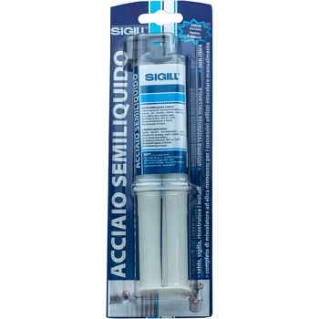 Tekući čelik 40 ml (ACCIAIO SEMILIQUIDO) - blister Epoksi-metalna dvokomponentna pasta vrlo visoke mehaničke i kemijske otpornosti. Služi za popravke brtvljenje i lemljenje svih vrsta metala. Upotrebljava se za popravak cijevi metalnih fitiniga, r