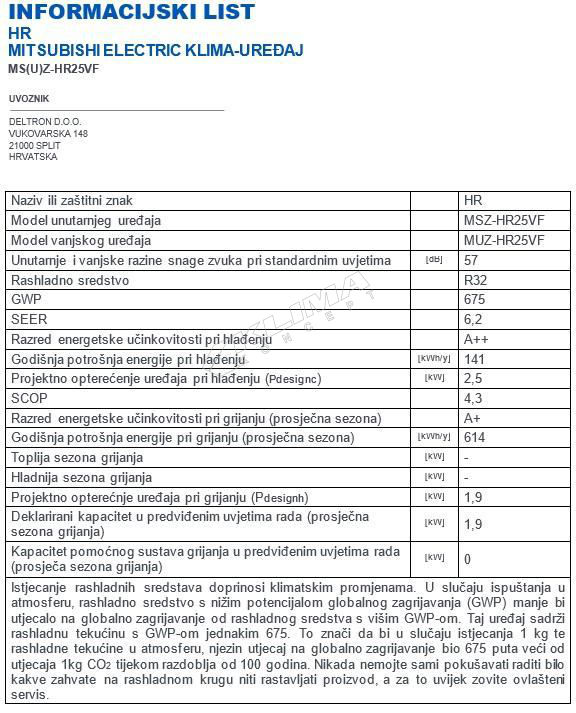 KLIMA UREĐAJ MITSUBISHI ELECTRIC MSZ/MUZ-HR25VFK WIFI 2.5kW/3,15kW KOMPLET