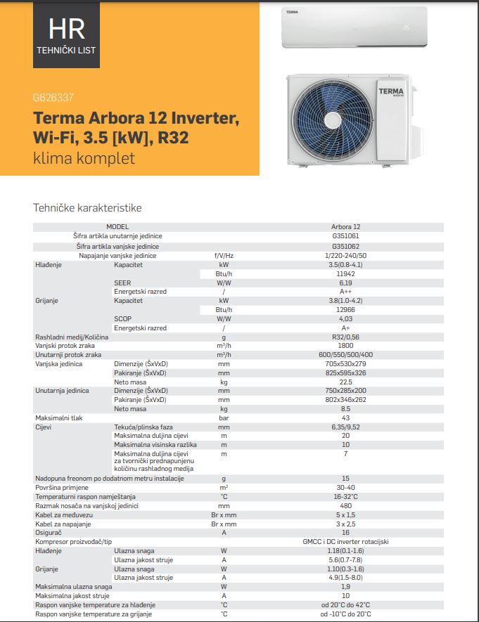 KLIMA UREĐAJ TERMA ARBORA12 INVERTER,WI-FI 3,5 KW R32