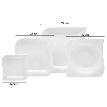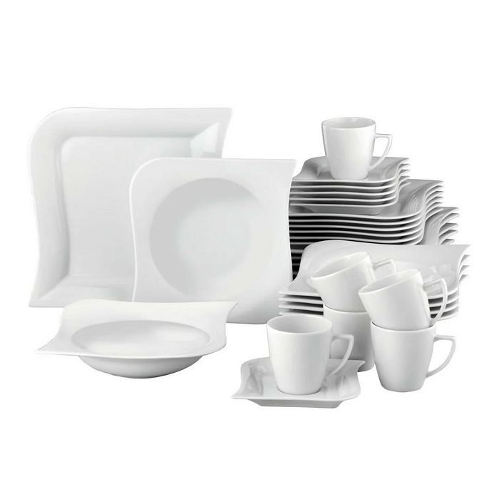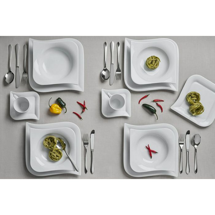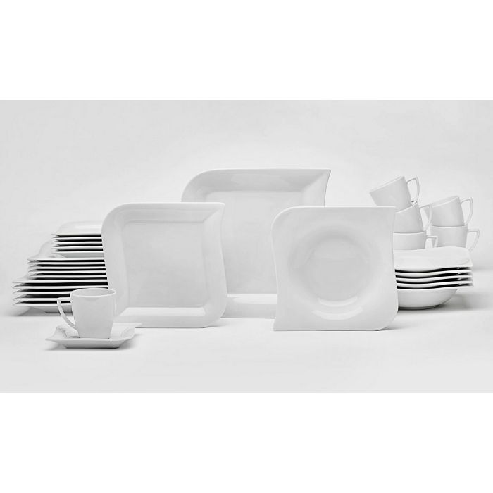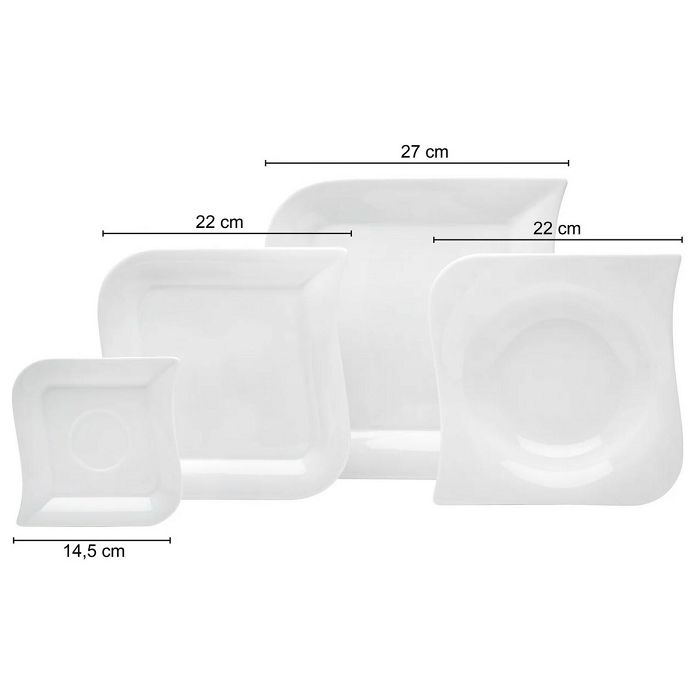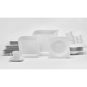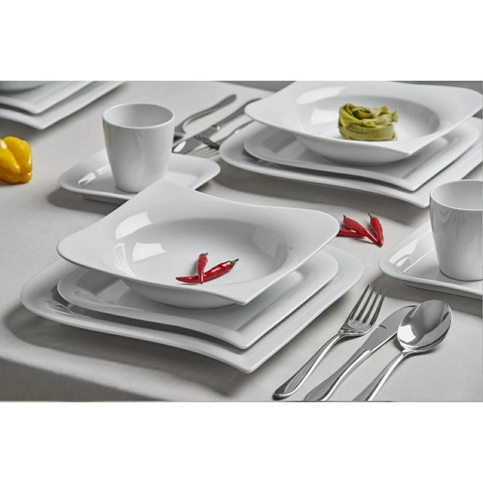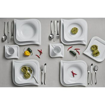 Kombinirani servis 'Opera' u bijeloj boji, izrađen od porculana prikladnog za mikrovalnu pećnicu, impresionira svojim zakrivljenim oblicima tanjura.