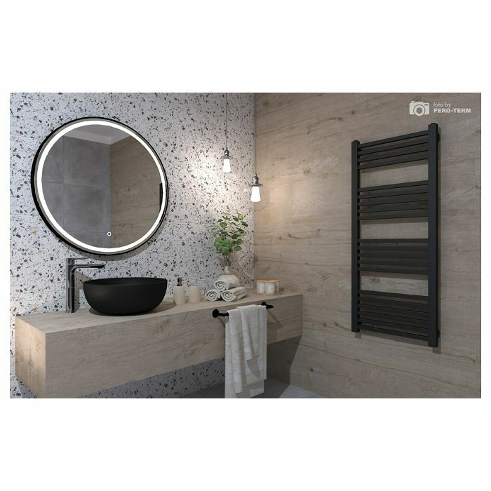 TermaBad R01 Black 1000x450 mm elegantni i učinkoviti kupaonski radijator ravnih linija. Idealno je rješenje za kupaonske prostore jer osim osnovne namjene grijanja prostora, može služiti i kao držač ručnika te zauzima minimalno prostora.