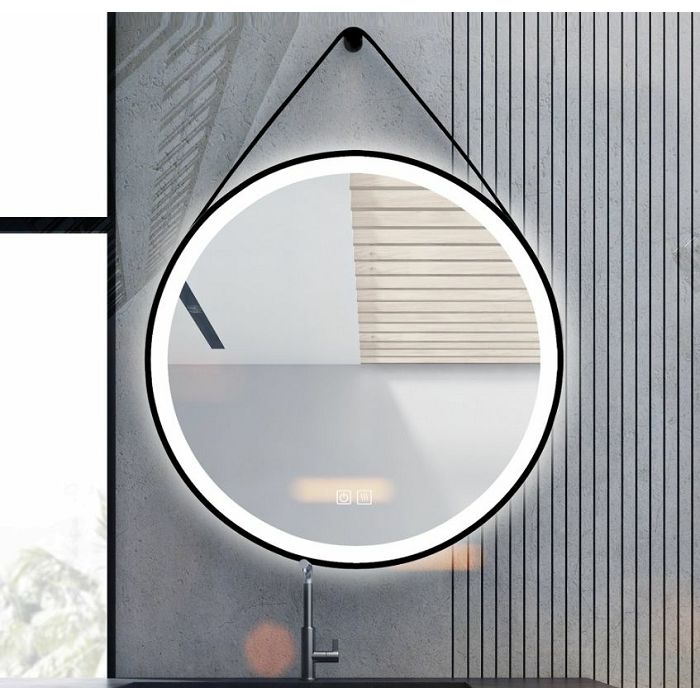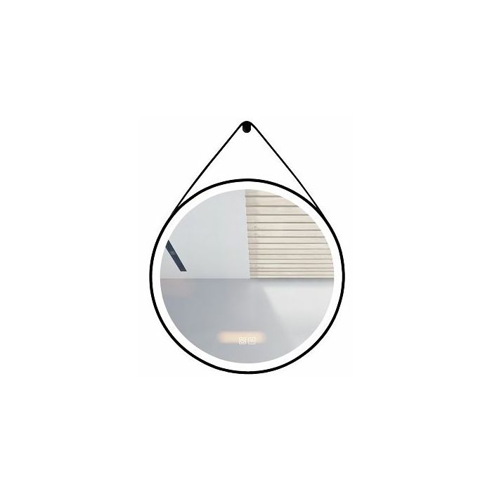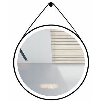 Opis:OGLEDALO S LED RASVJETOM, OVJESNO S REMENOM, CRNI OKVIR