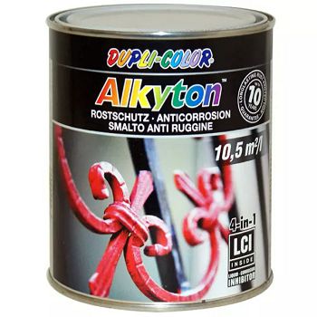 DUPLI-COLOR ALKYTON je antikorozivni sustav boja na bazi alkid-uretana, koji kombinira četiri proizvoda u jednom: temeljni premaz, zaštitu od hrđe, boju i brtvljenje. Ova boja s vrlo dobrom pokrivnošću iznimno je fleksibilna i otporna na udarce, čak