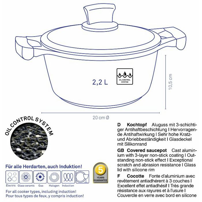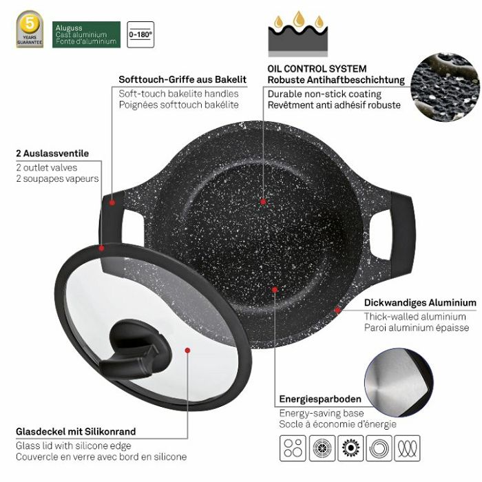 Poseban način obrade površine površine za prženje omogućuje tzv. Oil Control System. Stoga uštedite na ulju i masti i uživajte u ravnomjernoj raspodjeli ulja/