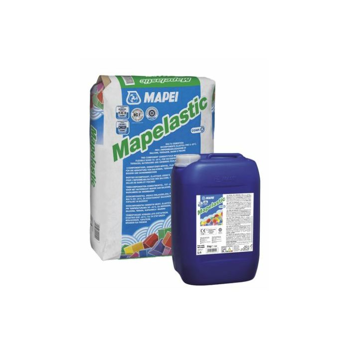 Mapei Mapelastic dvokomponentni visokoelastični cementni mort, fleksibilan do -20 °C, za hidroizolaciju balkona, terasa, kupaonica i bazena za plivanje. Izrađen na osnovi cementnih veziva, agregata fine granulacije, specijalnih doda