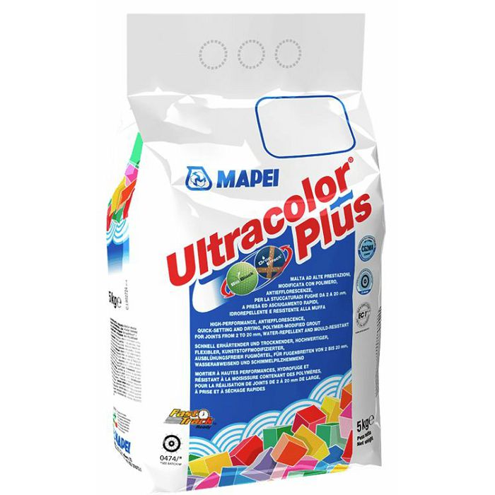 Mapei Ultracolor Plus je poboljšana,, brzovezujuća i brzosušeća masa za fugiranje za fuge širine 2 do 20 mm, ne uzrokuje iscvjetavanje, s dodacima za vodoodbojnost DropEffect® i sprječavanje pojave plijesni BioBlock®. Dostupno 30 boja prema ton karti