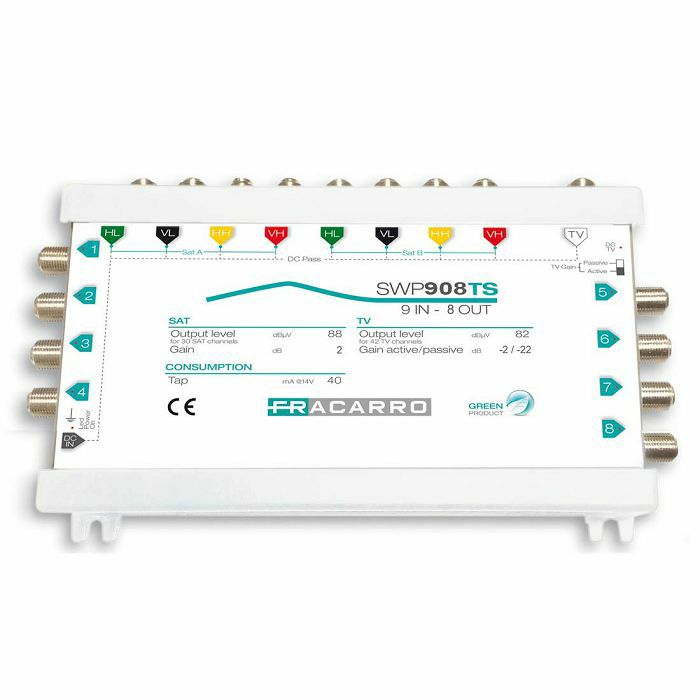 Kompaktni multiswitch s 9 ulaza i dip prekidačem za odabir aktivnog ili pasivnog TV pojačanja.
