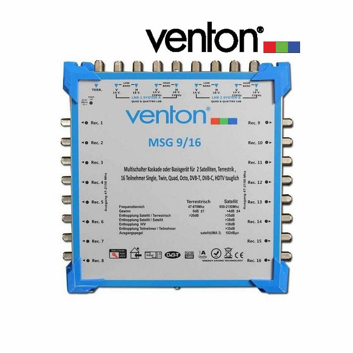Multiswitch MSG 9/24 Venton Germany. Ulaz 2 satelita + zemaljska TV. Izlaz na 24 utičnih mjesta. Kvalitetan multiswitch kompaktnih dimenzija. Prima Quatrro, Quad i Twin LNB-ove.Ugrađeno aktivno pojačalo za prijem zemaljskih programa.Ulazi: 8 + 1 : 2