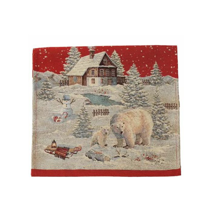 Božićni nadstolnjak sa slikom polarnih medvjeda ispred drvene planinske kuće s crvenom ili zlatnom pozadinom, donijet će pravu zimsku čaroliju na svaki stol.