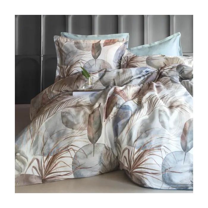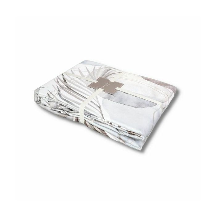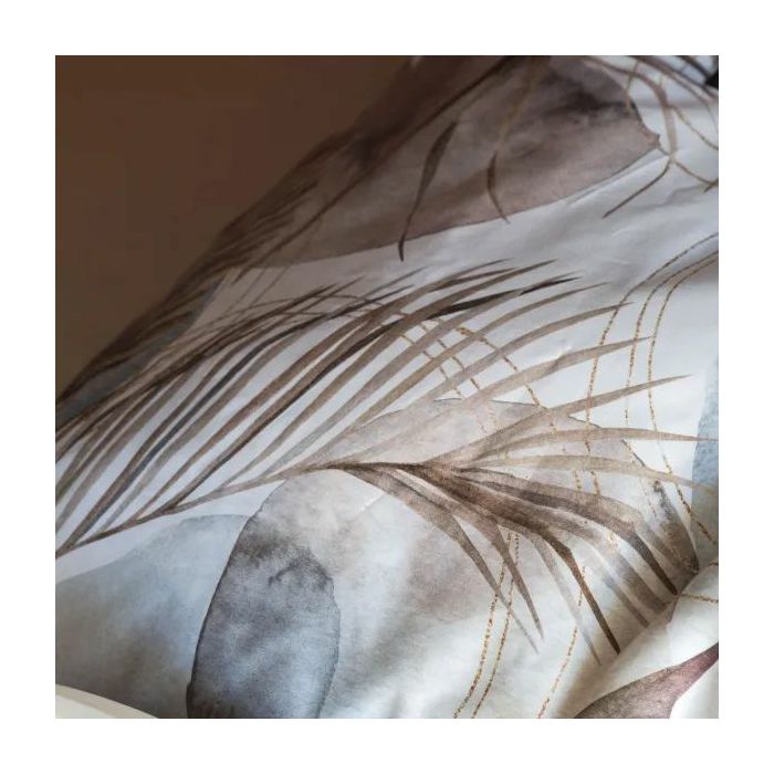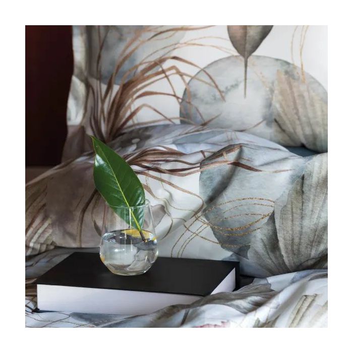 Set plahti s jastučnicama Caliari izrađen je od finog i mekanog pamučnog satena. Gornja plahta i gornja strana jastučnice ima printani dezen tamnosivog lišća na svijetlo sivoj podlozi. Donja plahta kao i donja strana jastučnice dolaze u