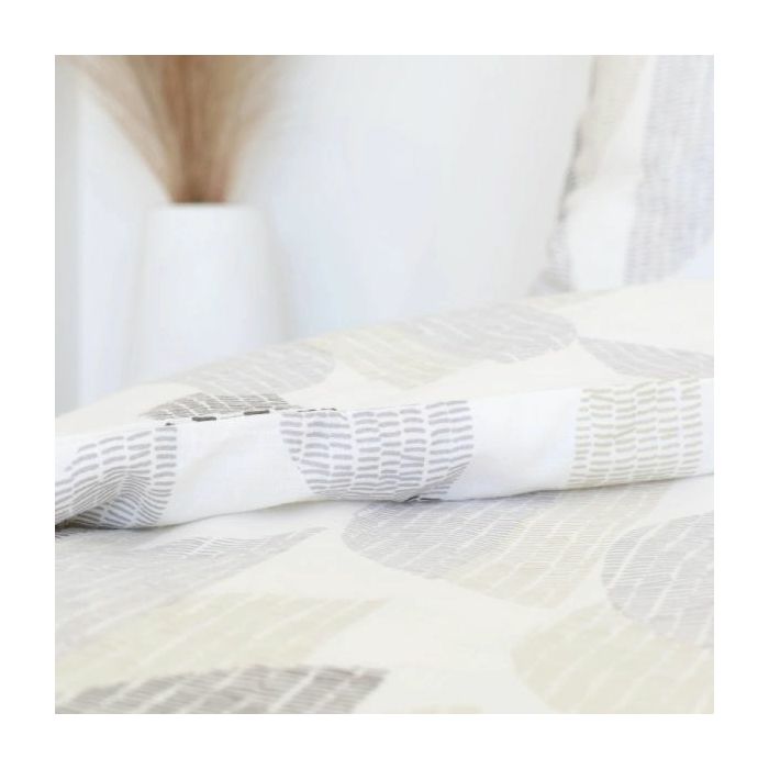 Set s navlakom Noa izrađen je od pamučnog platna. Navlaka i jastučnice imaju uzorak iscrtkanih, polukružnih oblika u sivim i bež tonovima. Navlaka za poplun zatvara se pomoću drukera, a jastučnice su s preklopom.