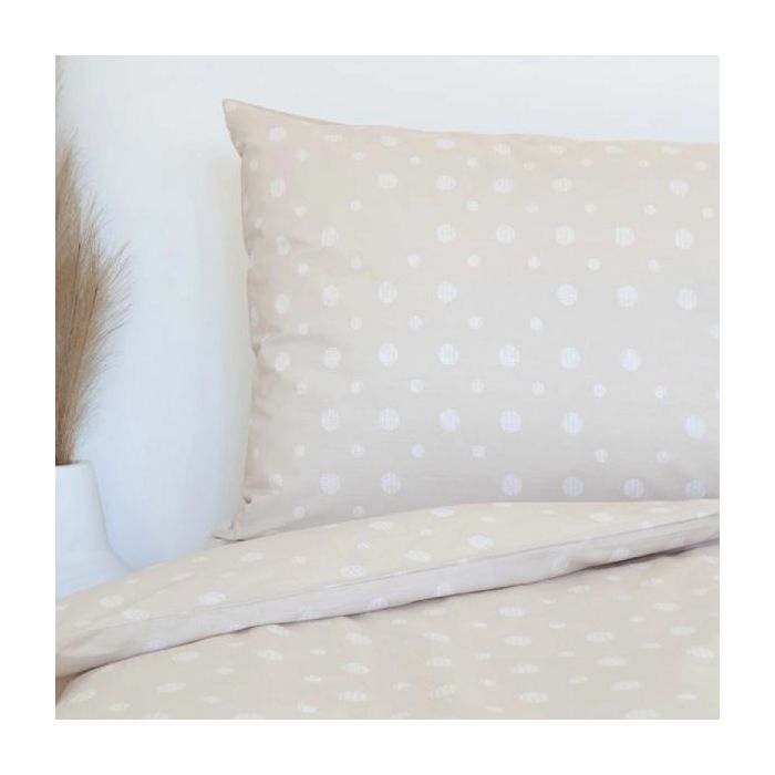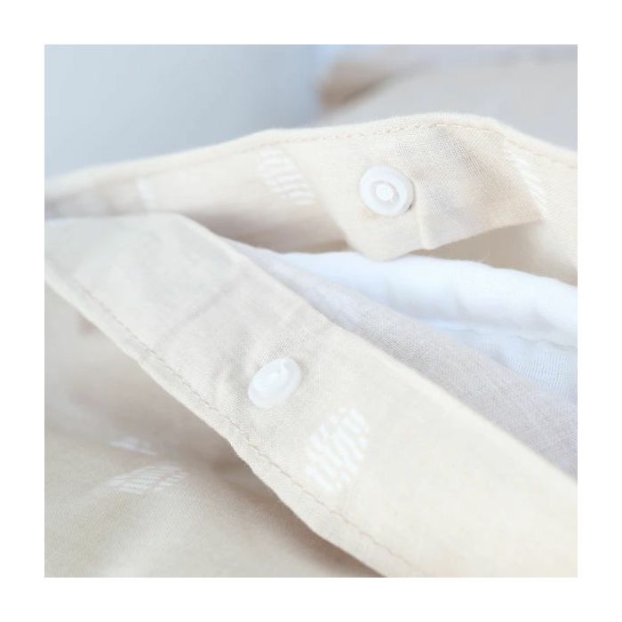 Set s navlakom Noa izrađen je od pamučnog platna. Navlaka i jastučnice imaju uzorak iscrtkanih, polukružnih oblika u sivim i bež tonovima. Navlaka za poplun zatvara se pomoću drukera, a jastučnice su s preklopom.