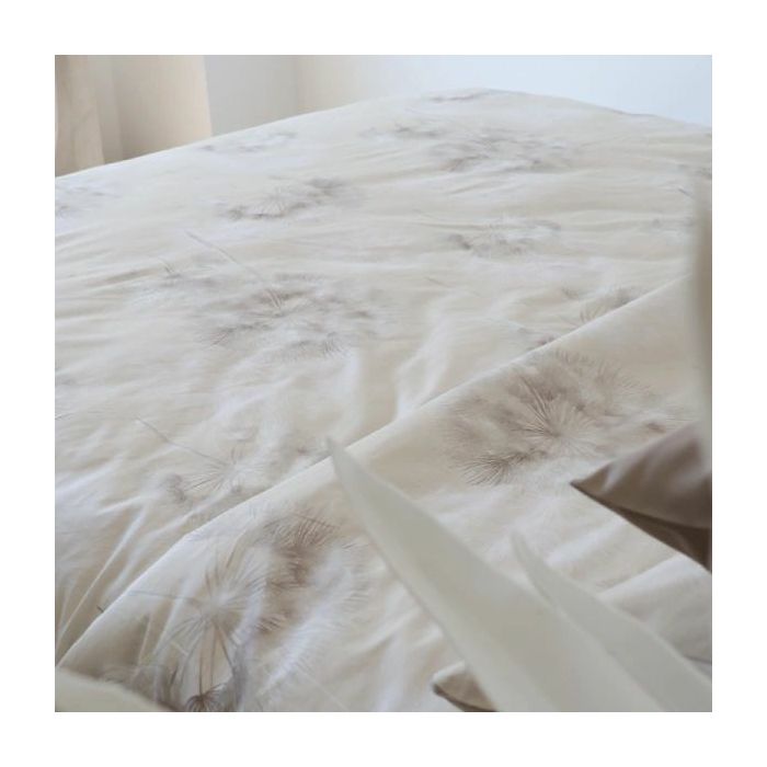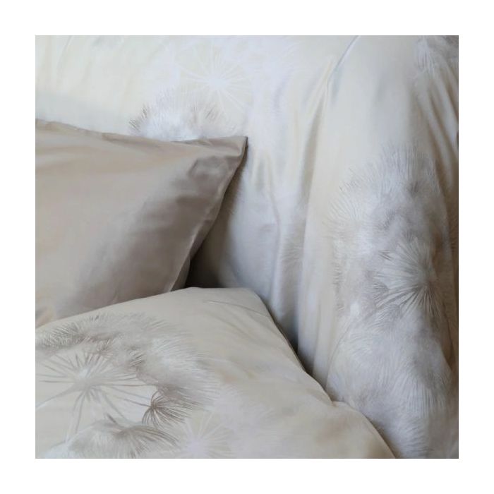 Set navlake za poplun s jastučnicama Palau izrađen je od finog pamučnog satena, mekan na dodir s nježnim motivima maslačaka u bijelim i sivim tonovima na bež podlozi. Palau posteljina iznimno je podatna satenska posteljina koja će svaki