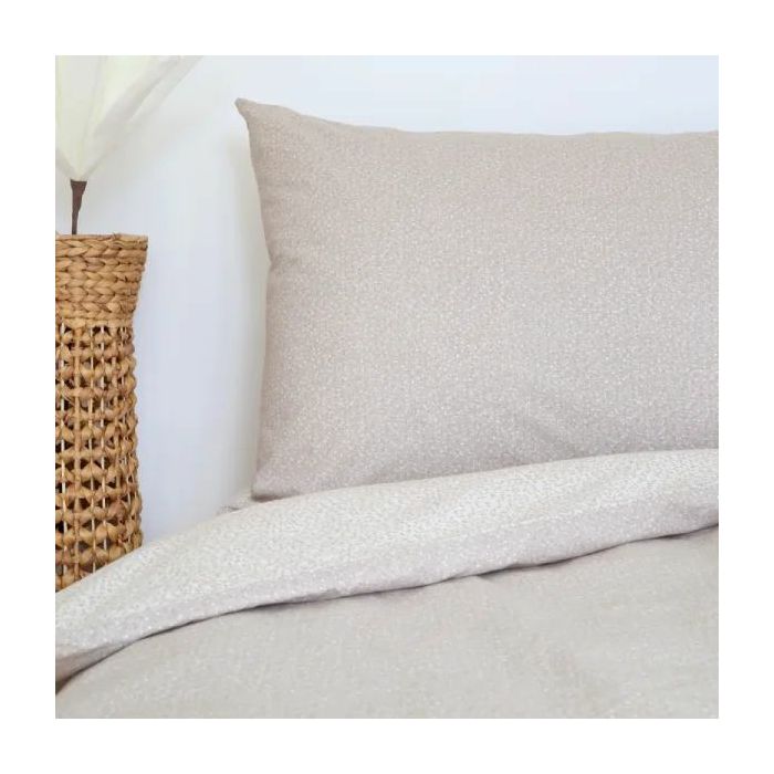 Set s navlakom Noa izrađen je od pamučnog platna. Navlaka i jastučnice imaju uzorak iscrtkanih, polukružnih oblika u sivim i bež tonovima. Navlaka za poplun zatvara se pomoću drukera, a jastučnice su s preklopom.