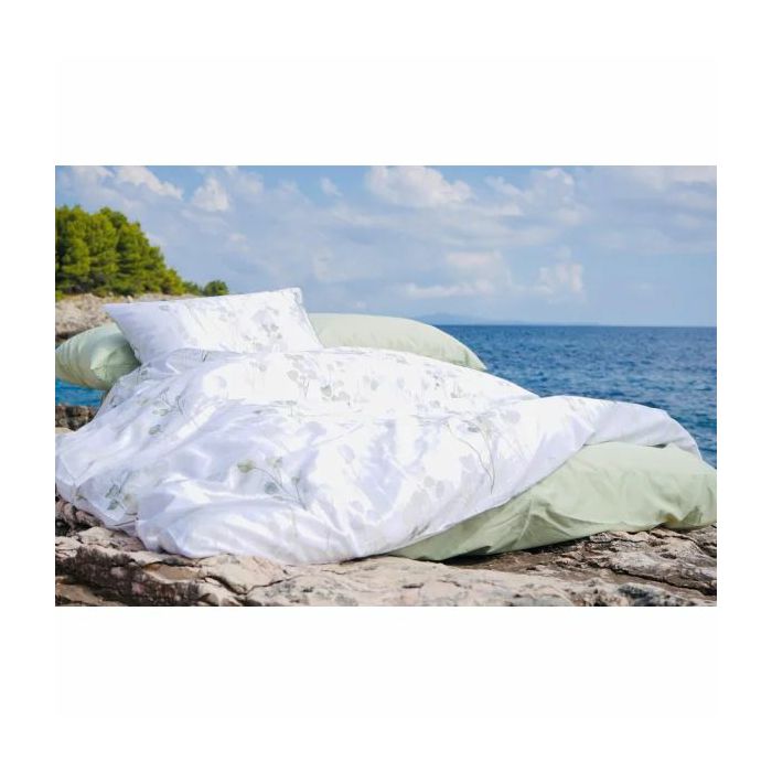 Set navlake za poplun s jastučnicama Ubud izrađen je od finog pamučnog satena, mekan na dodir s romantičnim cvjetnim motivima u zelenim i sivim tonovima na bijeloj podlozi. Ubud posteljina iznimno je podatna satenska posteljina koja će s