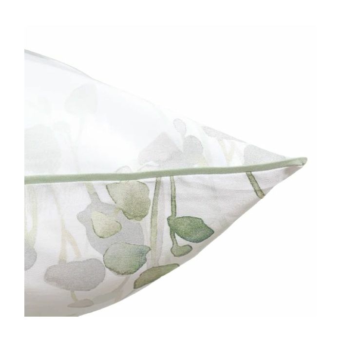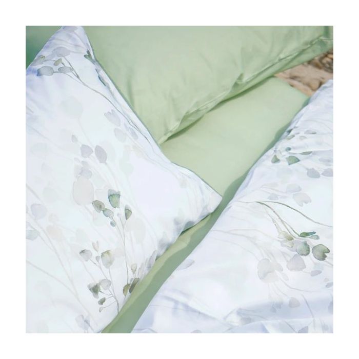 Set navlake za poplun s jastučnicama Ubud izrađen je od finog pamučnog satena, mekan na dodir s romantičnim cvjetnim motivima u zelenim i sivim tonovima na bijeloj podlozi. Ubud posteljina iznimno je podatna satenska posteljina koja će s