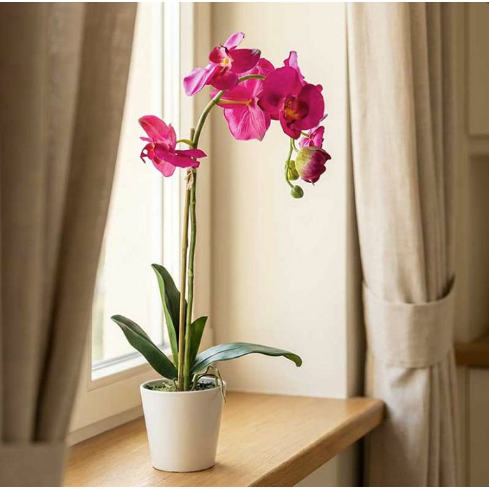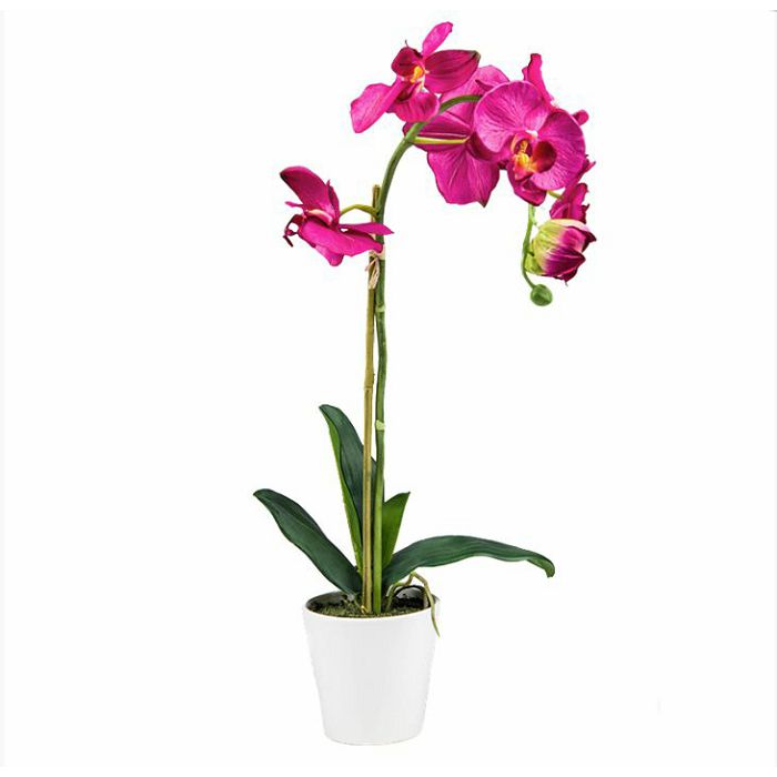 Ove umjetne orhideje visine 60 cm smještene su u modernu bijelu teglicu, čineći ih idealnim za ukrašavanje doma, ureda ili posebnih događanja.