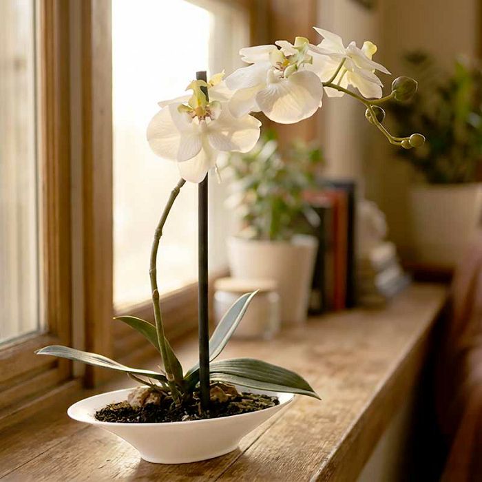 Elegantna umjetna orhideja u krem boji smještena je u dekorativnu ovalnu teglu koja upotpunjuje njezin prirodan i profinjen izgled.