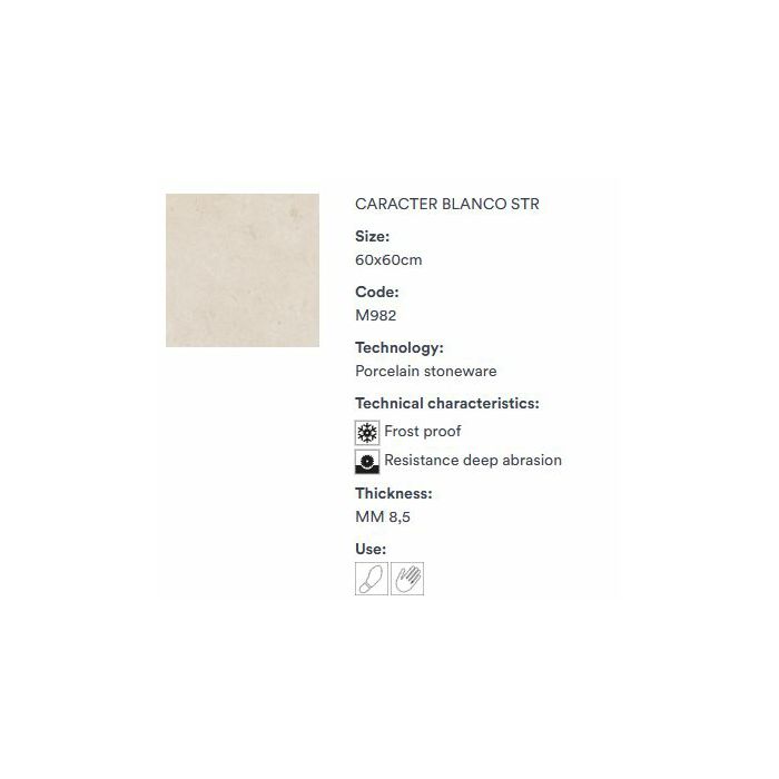 Carácter je kolekcija za unutarnje i vanjske podove s dvostrukom osobnošću: decentnom i minimalističkom, u bojama Blanco, Arena i Greige, te s odvažnim karakterom u istom broju varijanti boja od sive do smeđe,