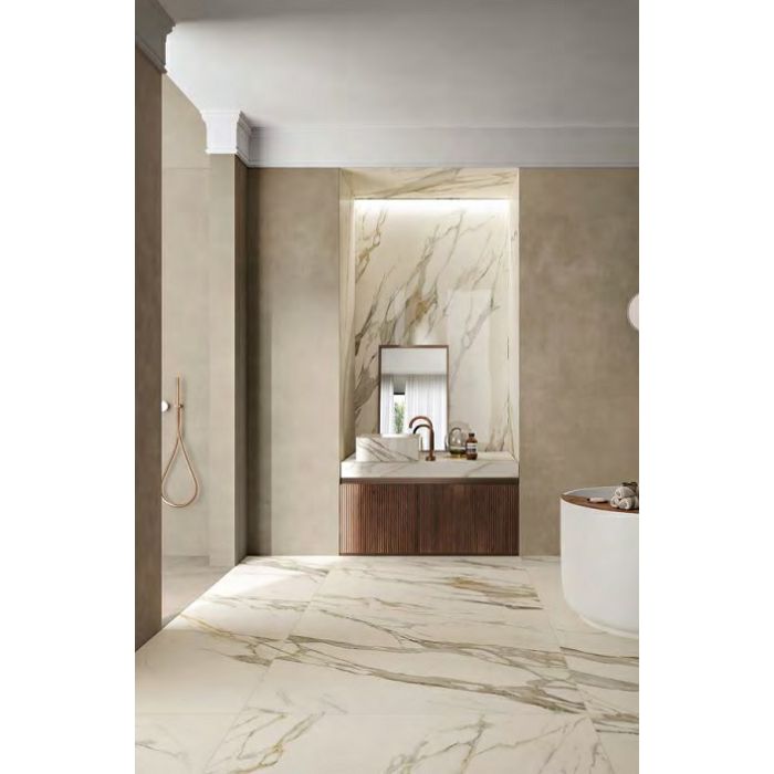 May Ceramics Pisa Gold Mat je podna pločica dimenzije 60x120 cm u imitaciji mramora, mat završne obrade i jake varijacije tonova. Pločica je izrađena od glaziranog porculana i ravno rezanih (retificiranih) je rubova što omogućuje polaganje sa minimal