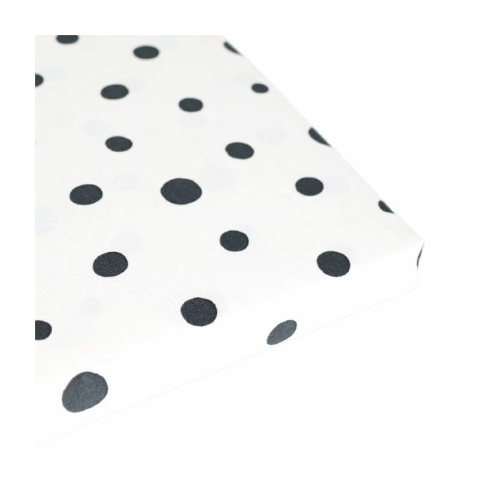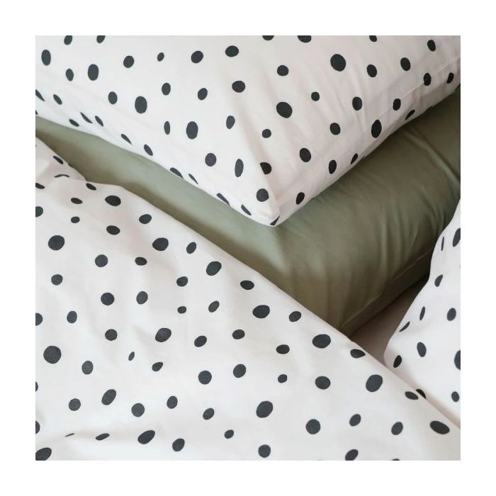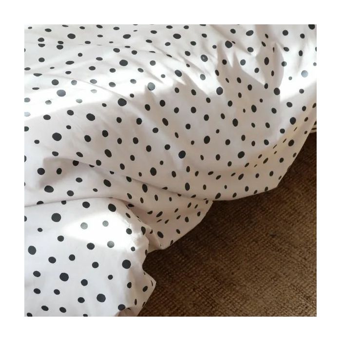 Set ravne gornje plahte i jastučnica A Pois izrađen je od pamučnog perkala, tkanine poznate po svojoj glatkoj, prozračnoj i izdržljivoj strukturi. Na bijeloj podlozi nalazi se bezvremenski točkasti uzorak, s crnim točkicama različitih ve