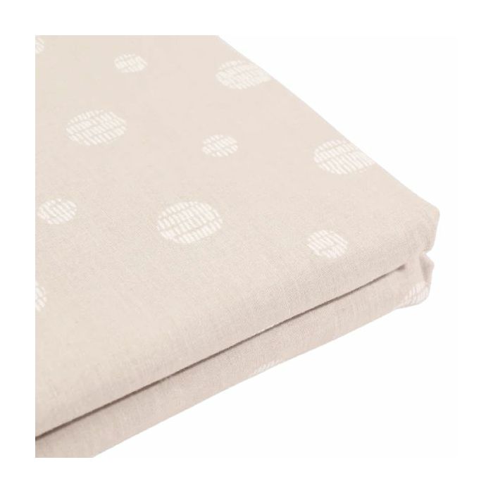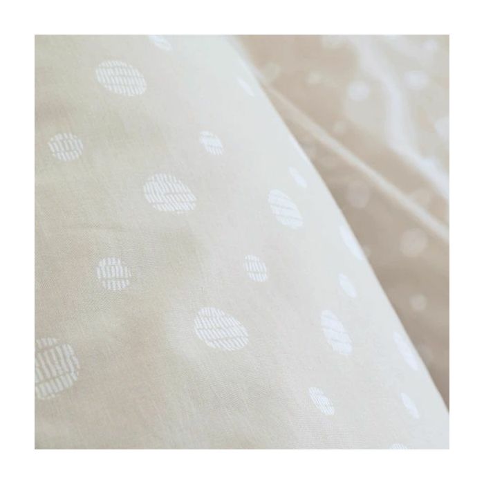 Set s gornjom plahtom i jastučnicama Noa izrađen je od klasičnog pamučnog platna. Gornja plahta i jastučnice Noa imaju uzorak bijelih iscrtkanih krugova na bež podlozi, minimalan dezen koji će se lako uklopiti uz svu ostalu posteljinu.