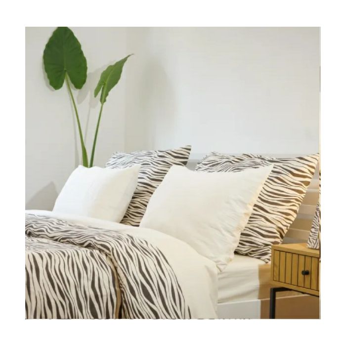 Set s gornjom plahtom Zebra izrađena je od finog pamučnog perkala koji je izrazito ugodan na koži, a dolazi u prepoznatljivom prugastom zebra printu smeđe boje na bež podlozi. Pamučni perkal je prozračan i lagan, što ga čini idealnim izborom za topl